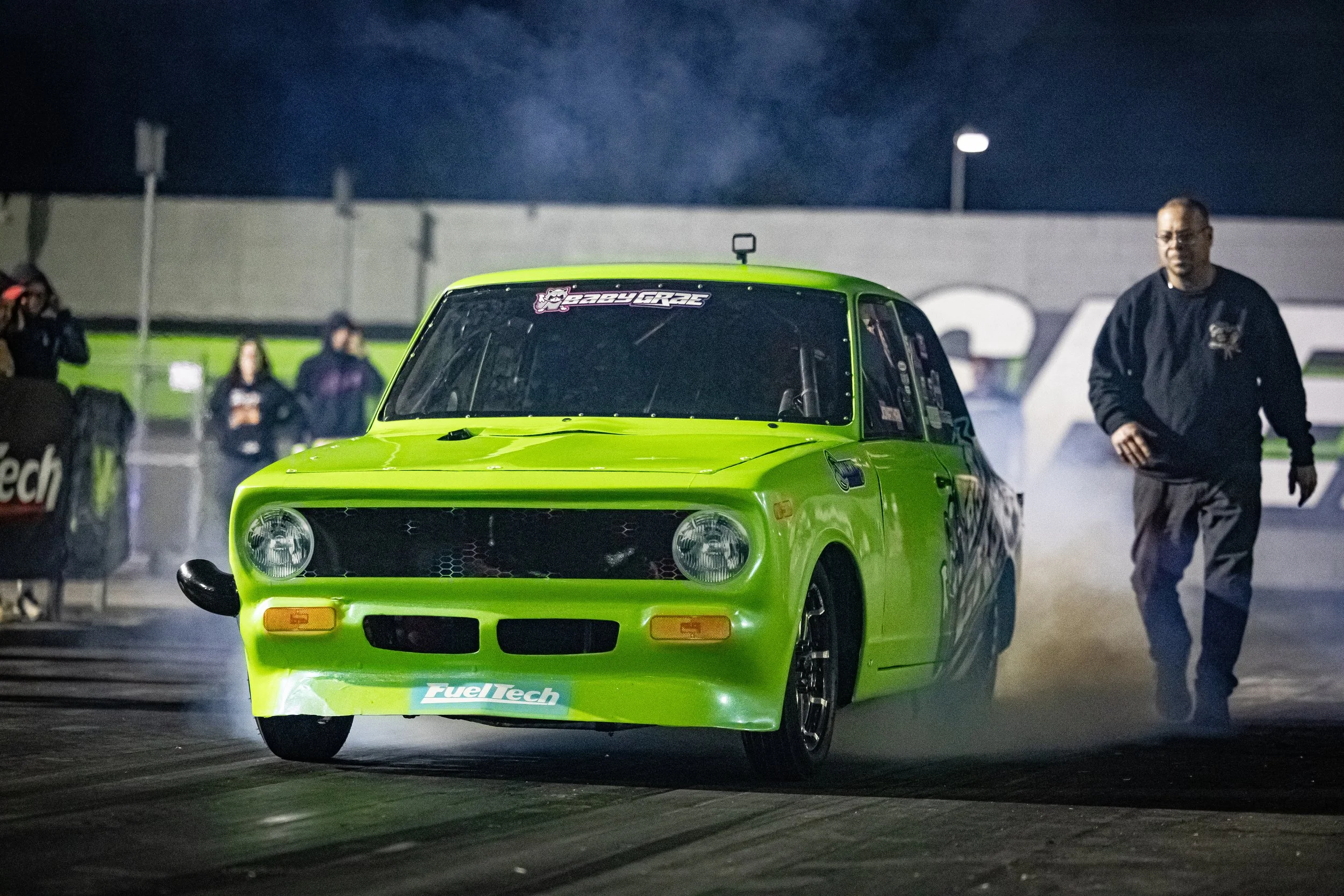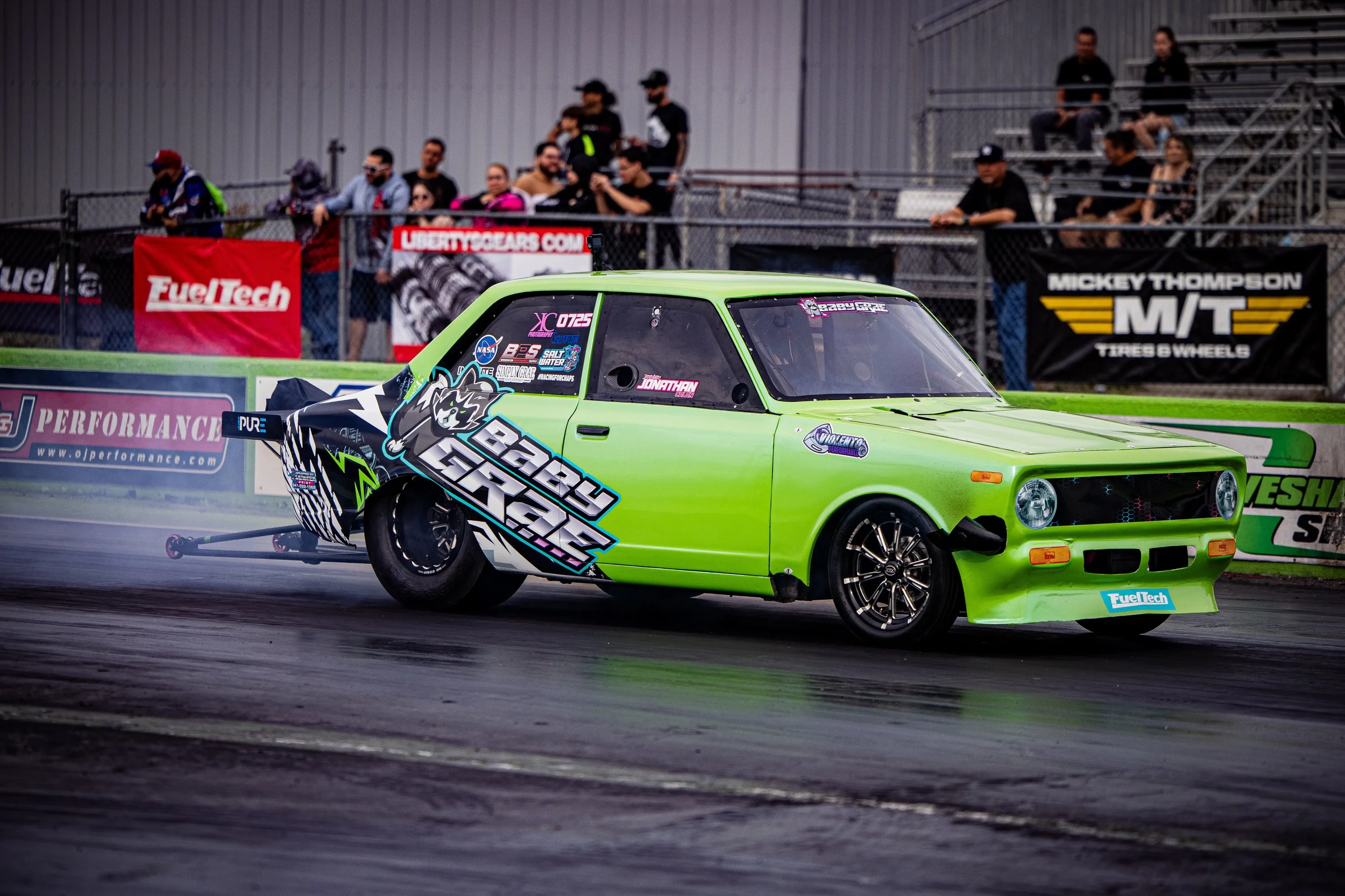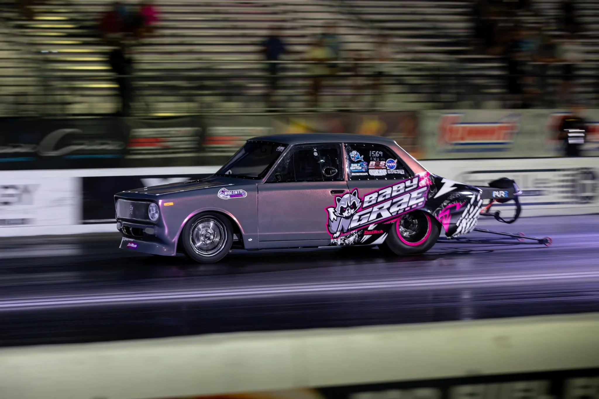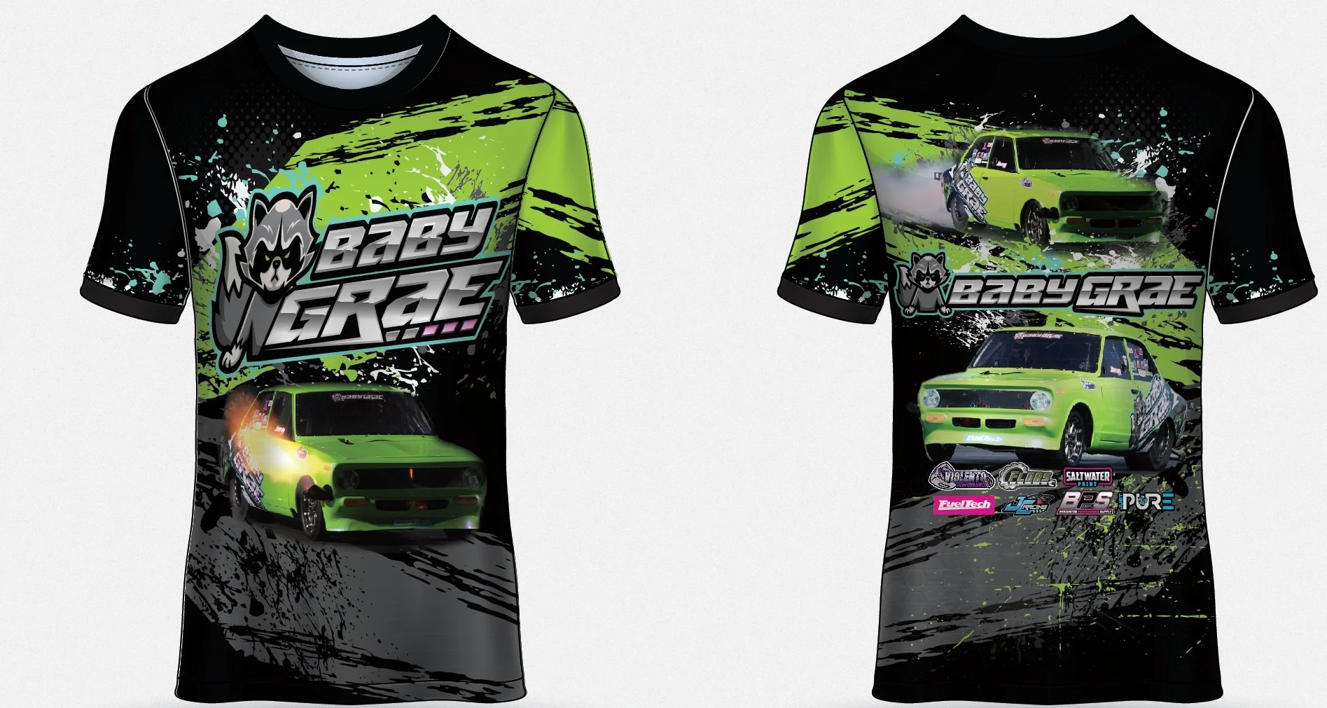 So I bought the car in 2020 and it was originally white. Then I had a daughter and felt the car needed some meaning, So we named the car Baby Grae, and I made a logo where the mascot animal is a racoon because Grae is a menace, which made it funny. With the name change we felt a color change was need so we asked Grae what color she wanted to use and she told us “pink sparkles”. So we made the car grey to pair with her name and we put Pink Sparkles over the grey (a 1of1 custom wrap by Saltwater Print) With race season around the corner it was time for the yearly color swap, and Grae this go around chose Green… VERY Green. At first I was opposed, so we tried to ask her multiple times if she was sure, showed her the swatch book and chose the green everytime. We even took the color out of the book to see if it caught her eyes because of the brightness; we were wrong. She cycled through all the colors and said “Daddy I don’t see my color”. She knew what she was looking for. So green it was and then she added “with blue sparkles” and now Baby Grae is again a 1of1 custom made by our awesome sponsor Saltwater Print who continuously make Grae’s vision a reality!
